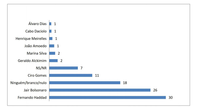 Seguem: Ciro Gomes com 11%; Geraldo Alckmin e Marina Silva, ambos com 2%, cada; João Amoedo, Henrique Meirelles, Cabo Daciolo e Álvaro Dias, cada um deles com 1%. Total de brancos e nulos foi de 18% e de indecisos foi de 7%.