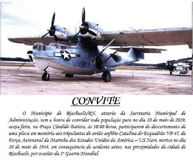 Nesta sexta-feira (10), às 10 horas na Praça Cândido Batista, ao lado da BR 304, naquela comunidade haverá uma solenidade de descerramento de uma placa em memória aos tripulantes do avião anfíbio Catalina do Esquadrão VP-45, da Força Aeronaval da Marinha dos Estados Unidos da América.