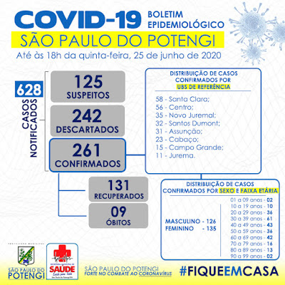 De acordo com o Boletim do coronavírus desta quinta-feira, 25, o nosso município registra mais 13 novos casos confirmados e 1 óbito. São 261 pessoas com coronavírus, desta resultado 131 já esta recuperado.