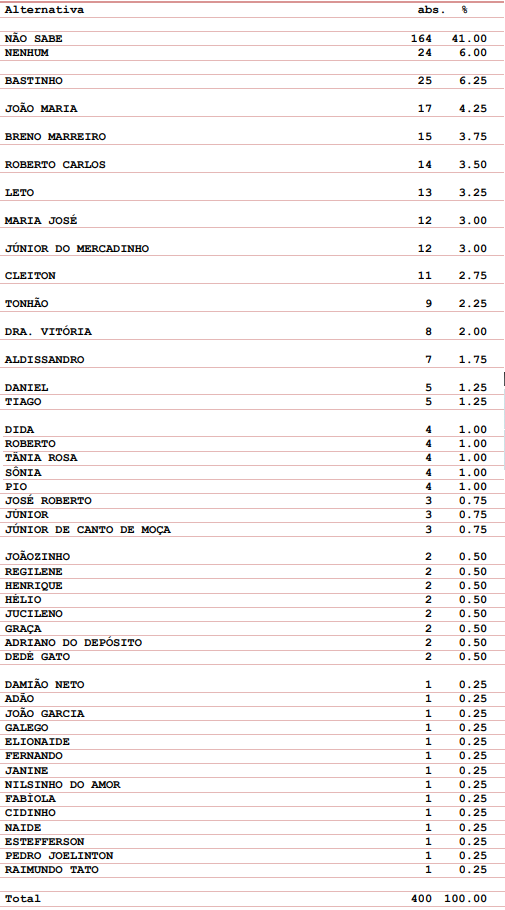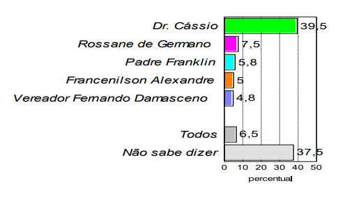 Em segundo aparecem empatados tecnicamente: o atual prefeito Doutor Cássio (16,75%), o vereador Francenilson Alexandre (15,5%) e o vereador Fernando Damasceno (12,25%). O pré-candidato Padre Franklin aparece em seguida com 3,25%. Um total de 13,25% se mostrou indeciso e 8,25% afirmou não votar em qualquer dos nomes.