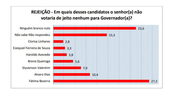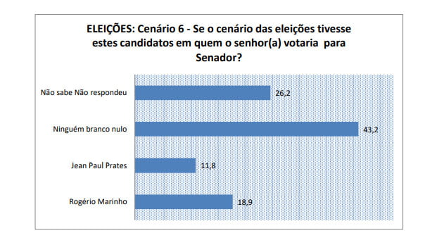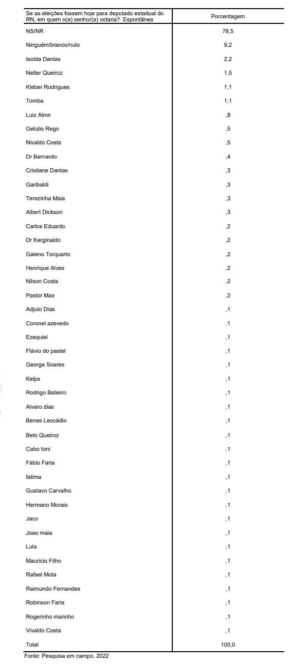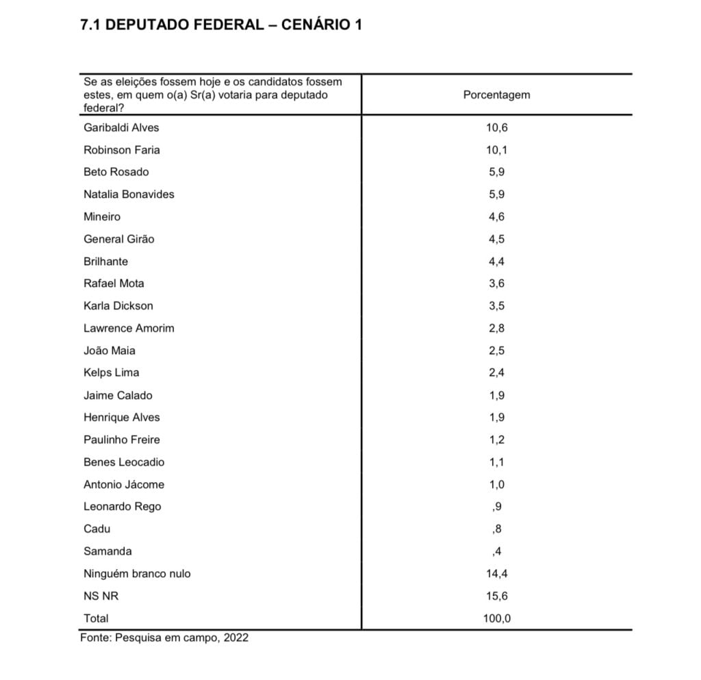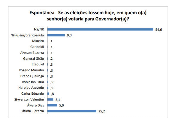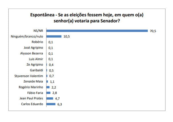 Ele é seguido pelo senador Jean Paul Prates (4,7%) e pelos ministros Fábio Faria (2,8%) e Rogério Marinho (2,2%). Os demais citados não atingiram 2%. Na espontânea, os indecisos somaram 70,5% e os brancos e nulos, 10,5%.