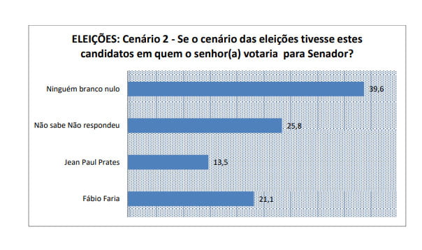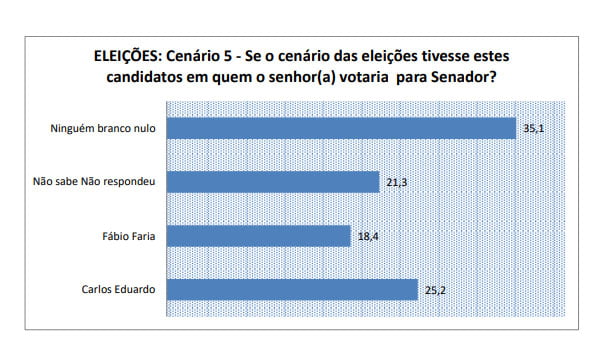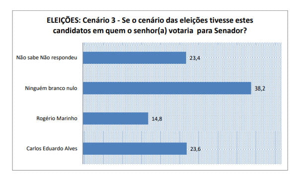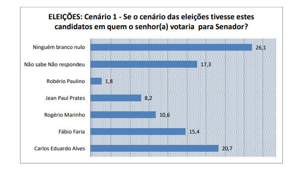 A pesquisa do instituto Seta também quis saber do eleitorado potiguar a intenção de votos para o representante potiguar do Senado Federal nas eleições desse ano nos cenários espontâneo e estimulado, lembrando que o Rio Grande do Norte elege apenas um candidato. No cenário espontâneo, o ex-prefeito de Natal Carlos Eduardo Alves lidera com 6,3%.
