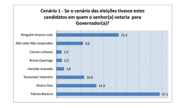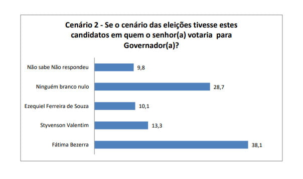 Em seguida aparecem o prefeito Álvaro Dias com 14,4% e o senador Styvenson Valentim com 10%. O empresário Haroldo Azevedo ainda foi citado por 2,8%, acima da margem de erro amostral da pesquisa. Brancos e nulos somaram 22,4%. Os indecisos corresponderam a 9,6%.