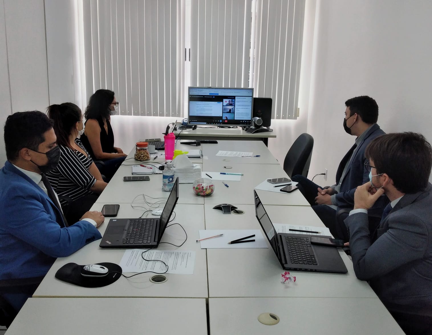 A sessão de negociação foi realizada de forma mista, sendo parte dela presencial, com a participação da coordenadora do CAOP Meio Ambiente, promotora de Justiça Rachel Germano, do 2° promotor de Justiça da comarca de Macau, Mac Lenon Lira dos Santos Leite, do prefeito Arthur Henrique da Fonseca Teixeira, do procurador-geral do Município Sanderson Liênio da Silva Mafra, da assistente ministerial Janny Suênia e do técnico do MPE/NUPA, Cassius Varela. A sessão também foi realizada de modo virtual, com participação da coordenadora do NUPA, promotora de Justiça Maria Danielle Simões Veras Ribeiro, e dos secretários municipais de Planejamento, Rodrigo Lima, de Obras, Igor Montenegro, e de Meio ambiente de Guamaré, Thiago Macena.
