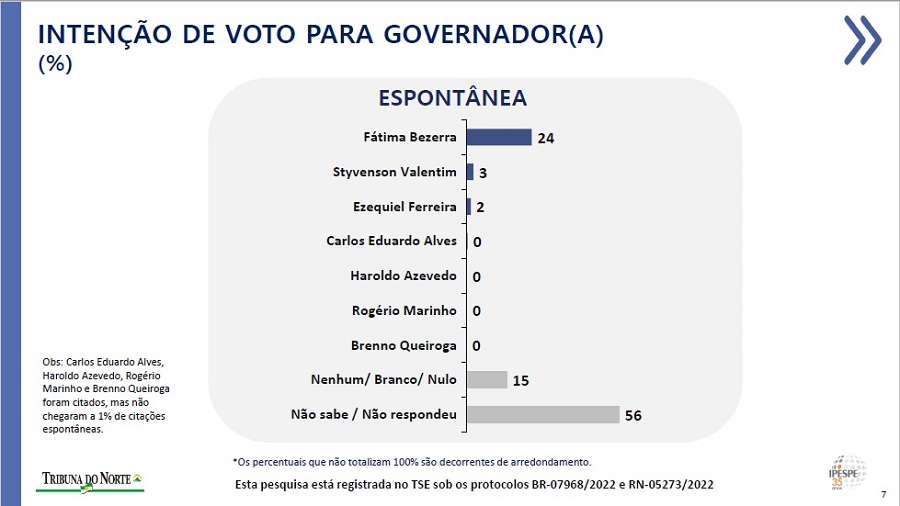 Na pesquisa espontânea, a governadora Fátima Bezerra também lidera com 24% das citações, seguida de Styvenson Valentim, com 3% e Ezequiel Ferreira, com 2%. Outros nomes foram citados, mas não chegaram a 1% das menções.