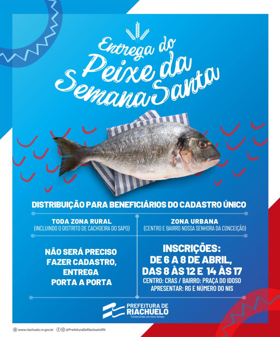 Já os moradores da Zona Rural e do distrito de Cachoeira não precisarão fazer inscrição, pois a distribuição do peixe será realizada porta a porta. “Este ano, o prefeito Joca Basilio determinou a ampliação da distribuição para que mais famílias possam ter acesso ao alimento. Vamos proporcionar um feriado santo, digno e farto as famílias”, ressaltou o secretário da Assistência Social, Dr Damião Neto.