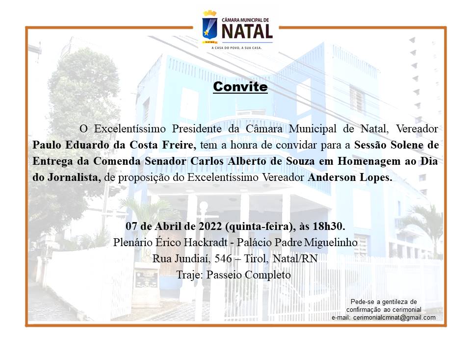 A Câmara Municipal de Natal entregará a Comenda Carlos Alberto de Sousa, em homenagem aos profissionais da imprensa natalense, nesta quinta-feira (7).