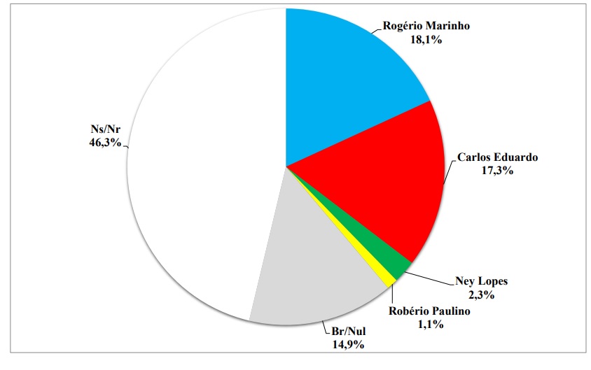 Numericamente em segundo e tecnicamente empatado, aparece o ex-prefeito de Natal, Carlos Eduardo Alves com 17,3% da preferência do eleitorado. Os demais nomes não atingiram a margem de erro amostral da pesquisa. Os indecisos corresponderam a 46,3% do eleitorado. Brancos e nulos somaram 14,9%.