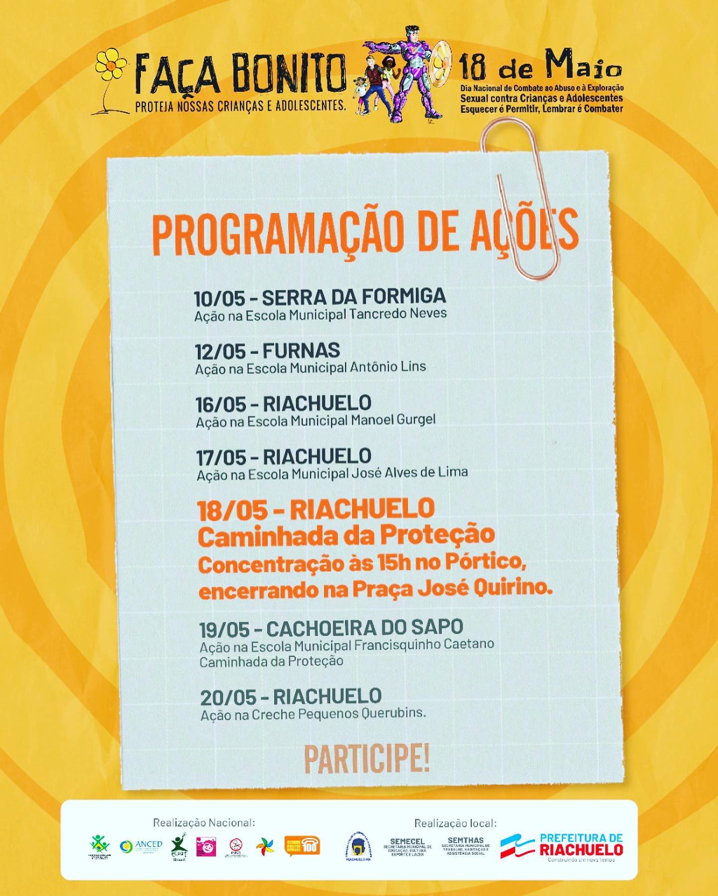 A Prefeitura Municipal de Riachuelo, numa ação conjunta entre as secretarias da Assistência Social e da Educação, Conselho Tutelar e Conselho Municipal dos Direitos da Criança e do Adolescente, vai promover diversas ações de conscientização que vão abordar a importância do enfrentamento à violência.