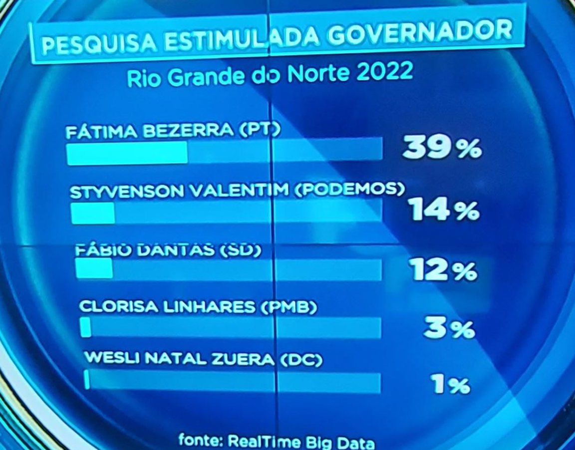 Pesquisa realizada pelo Instituto RealTime BigData sobre a disputa ao Governo do Rio Grande do Norte e divulgada nesta terça-feira (24) pela TV Tropical e pelo Portal da Tropical aponta que a atual governadora, Fátima Bezerra (PT), tem 39% das intenções de votos na pesquisa estimulada, quando são apresentados os nomes dos candidatos.