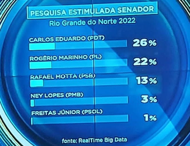 A pesquisa RealTime Big Data também ouviu os eleitores sobre a eleição para o Senado. Ex-prefeito de Natal, Carlos Eduardo (PDT) tem 26% das intenções de voto em pesquisa estimulada. O ex-ministro Rogério Marinho (PL) tem 22%. O deputado federal Rafael Motta (PSB) soma 13% da intenções.