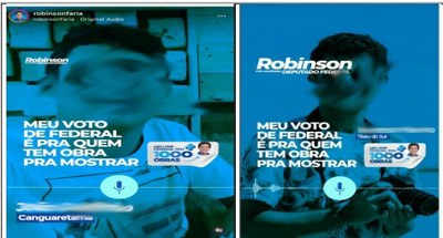 A Lei das Eleições proíbe que pretendentes a cargos públicos efetuem pedidos expressos de votos no chamado período de pré-campanha. Nas postagens, eleitores aparecem ao lado da mensagem “Meu voto de federal é para quem tem obra pra mostrar” atrelada à imagem do ex-governador, com uso de expressões como “Robinson Deputado Federal” e “Meu pré-federal tem 1000 obras”.