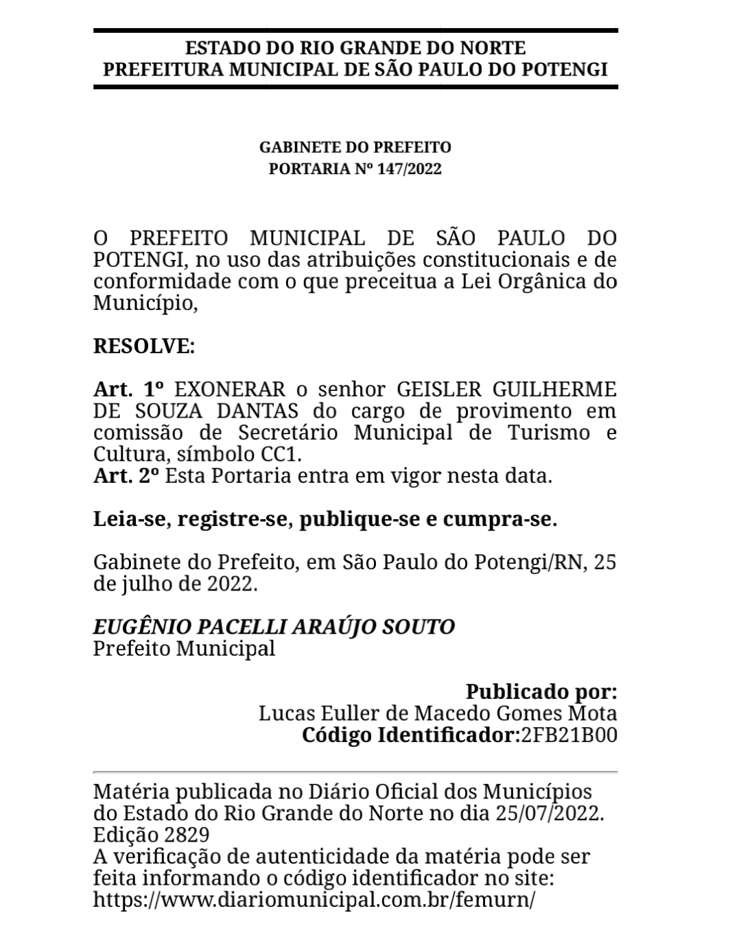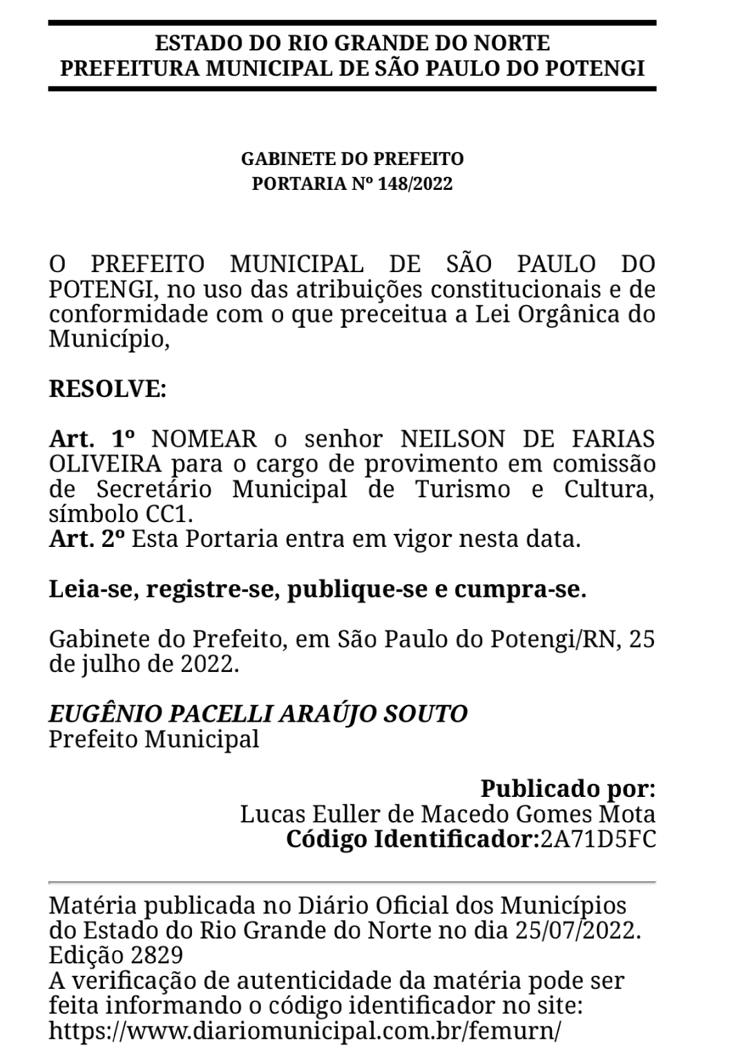 Nesta segunda-feira (25) o portal do Diário Oficial dos Municípios confirmou o que já havíamos falado. Em portaria publicada, traz a exoneração de Guilherme e a nomeação de Neilson.
