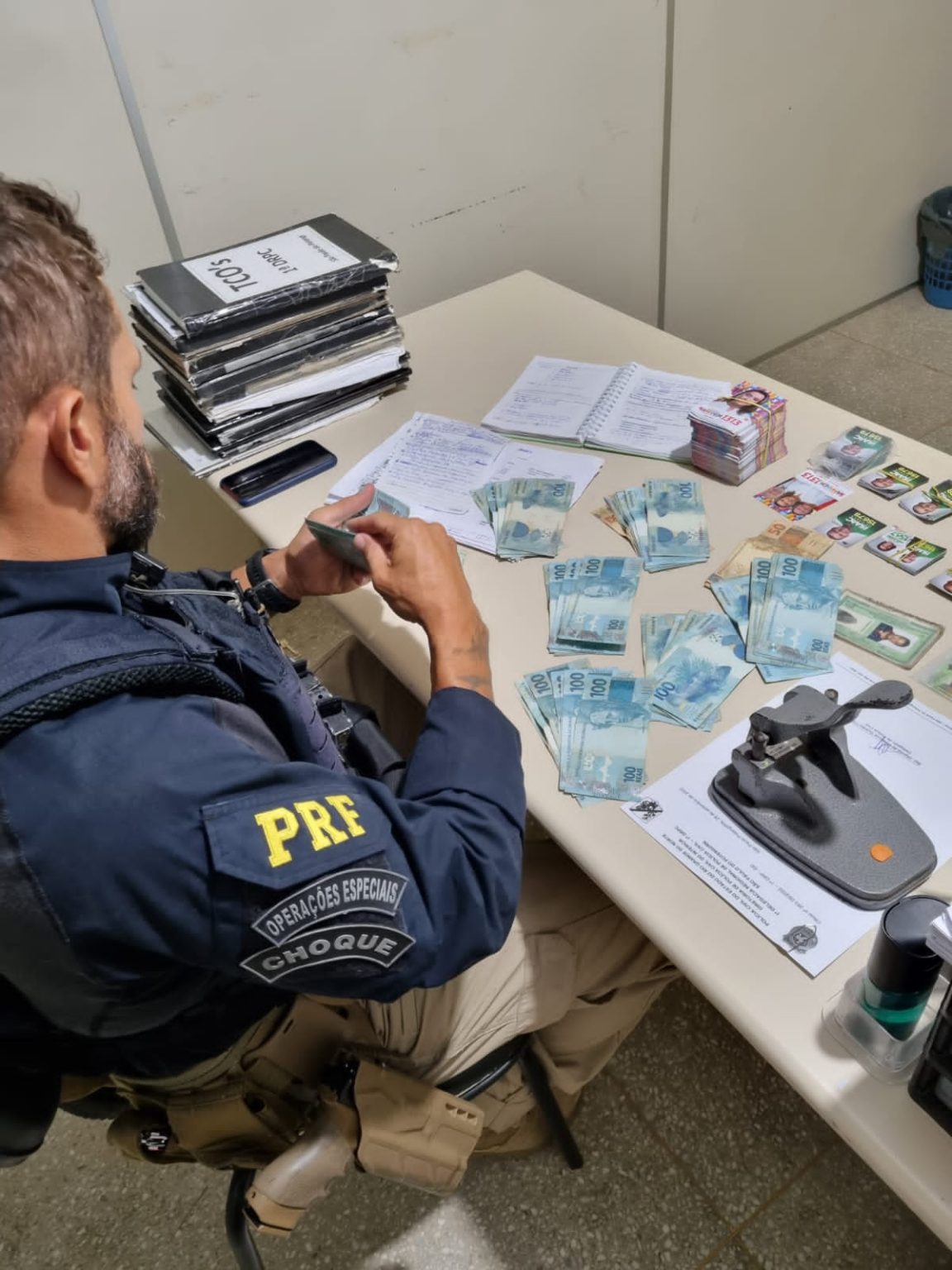 FOTOS: PRF prende no RN casal com a quantia de R$ 8.615,00 em espécie, vasto material de campanha e lista de quem receberia o dinheiro