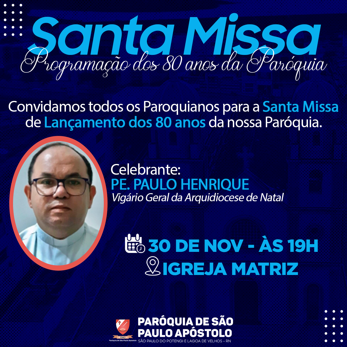 Nesta quarta-feira, 30 de novembro, às 19h, será realizado a Santa Missa de abertura da programação dos 80 anos de criação da Paróquia de São Paulo Apóstolo em nossa cidade. A Santa Missa será presidida pelo Vigário Geral da Arquidiocese de Natal, Pe. Paulo Henrique.
