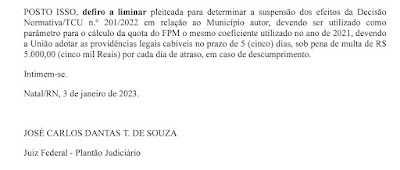 Na decisão liminar, o Juiz Federal Dr. José Carlos Dantas T. De Souza, considerou que: “De fato, além da alteração ter sido realizada nos últimos dias do ano de 2022, surpreendendo o Município e gerando a necessidade urgente de adequação do orçamento ao novo coeficiente, há que se reconhecer que, de fato, o censo demográfico iniciado em 2022 ainda não chegou ao fim, não se vislumbrando o preenchimento integral do requisito previsto no art. 2.º, §3.º da Lei Complementar n.º 91/1997, com a redação inserida pela Lei Complementar n.º 165, de 2019”.