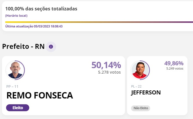 Remo Fonseca (PP) venceu Jefferson Santos (PL) por 29 votos de diferença e foi eleito prefeito da cidade de Ipanguaçu neste domingo (5).