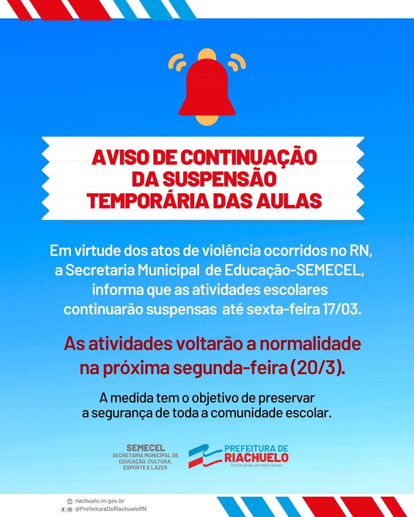 A Prefeitura Municipal de Riachuelo através da Secretaria Municipal de Educação, emitiu um aviso para toda rede municipal escolar na tarde desta quarta-feira (15). Em virtude dos acontecimentos no RN, a Secretaria de Educação continuarão com as aulas suspensas até a próxima sexta-feira (17).