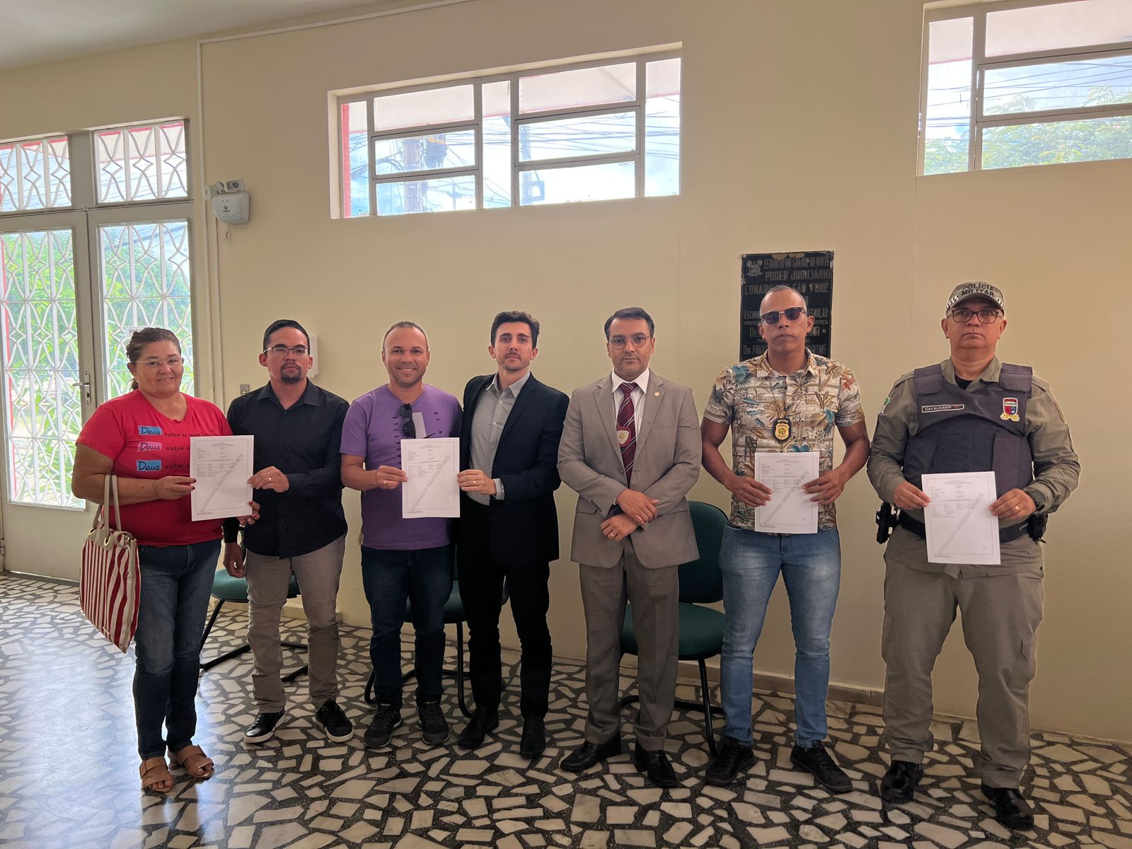 Participaram da solenidade, o chefe de secretaria, Pablo Ramon da Silva, o delegado da 34ª DPC Júlio César Barbosa da Costa, o agente de Polícia Civil Alexsandro José da Silva, o representante da Polícia Militar sargento Clebson Andrade Cavalcanti, a representante da APROMEP. Maria de Fátima Bezerra (APROMEP) e o o representante da Associação de Jovens, Ação e Cidadania José Alcivan da Silva.