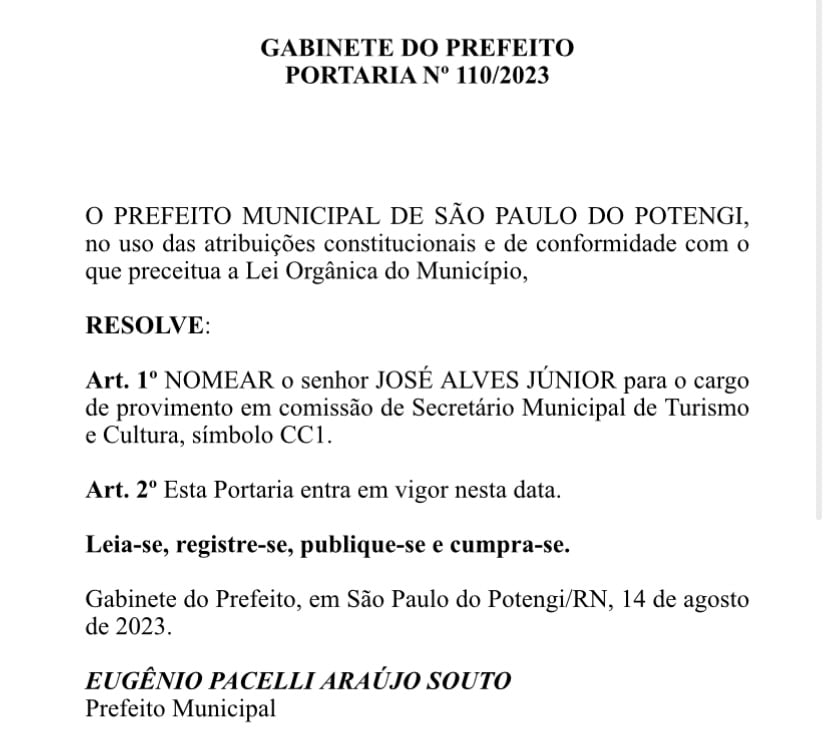 Com a saída de Neilson Farias da pasta de Turismo e Cultura de São Paulo do Potengi, quem passa a comandar a Secretaria, é o Potengiense Maestro Júnior.