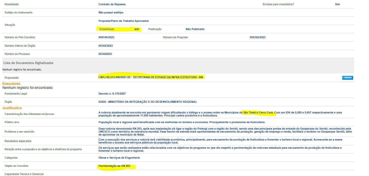 “É com imensa satisfação que compartilho com vocês uma excelente notícia: recebi, há pouco tempo, a confirmação do Senador Rogério Marinho sobre o empenho de 10 milhões de reais destinados à nossa estrada da produção. Essa notícia nos coloca cada vez mais próximos do nosso tão almejado sonho. Esses recursos representam não apenas um investimento financeiro, mas também um compromisso sólido com o progresso da nossa região”, disse o prefeito Babá.