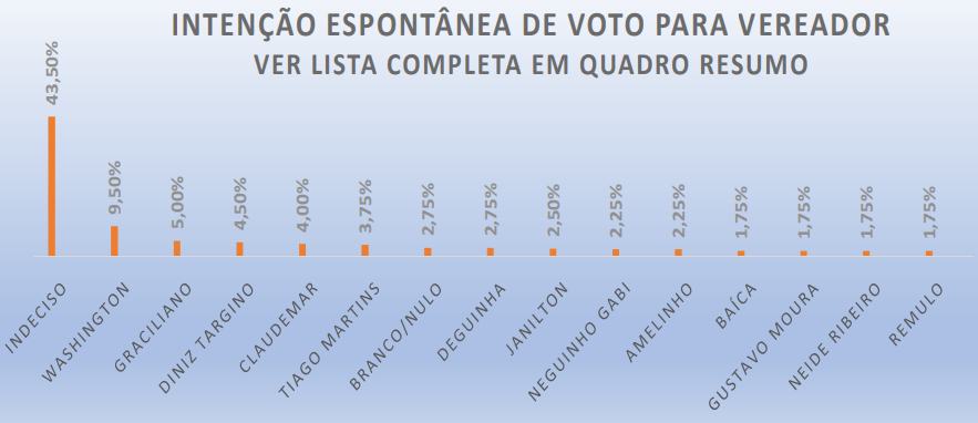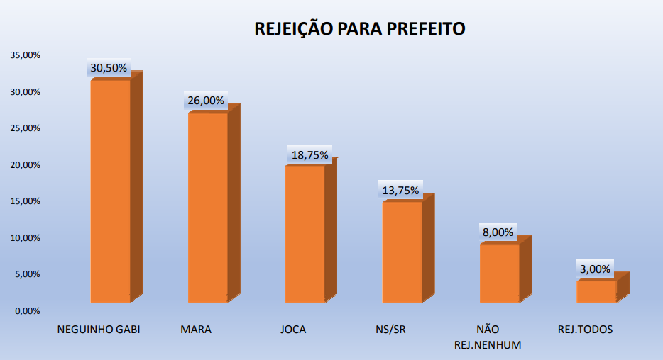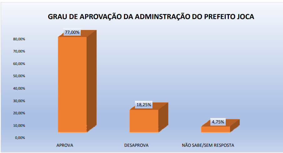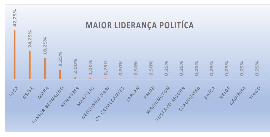 A PESQUISA PERFIL / BG / RIACHUELO também perguntou qual a maior liderança política do município. O prefeito Joca é o principal líder para 42,2%, já 24,2% não sabem, Mara tem 18,2%, Junior Bernardo 8,2%, confira lista completa abaixo.