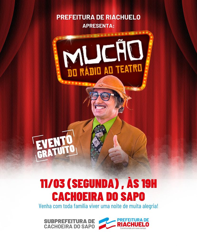 A Prefeitura de Riachuelo anunciou o evento gratuito “Mução – Do Rádio ao Teatro“, que ocorrerá nesta segunda-feira, às 19 horas, em praça pública, no distrito de Cachoeira do Sapo.