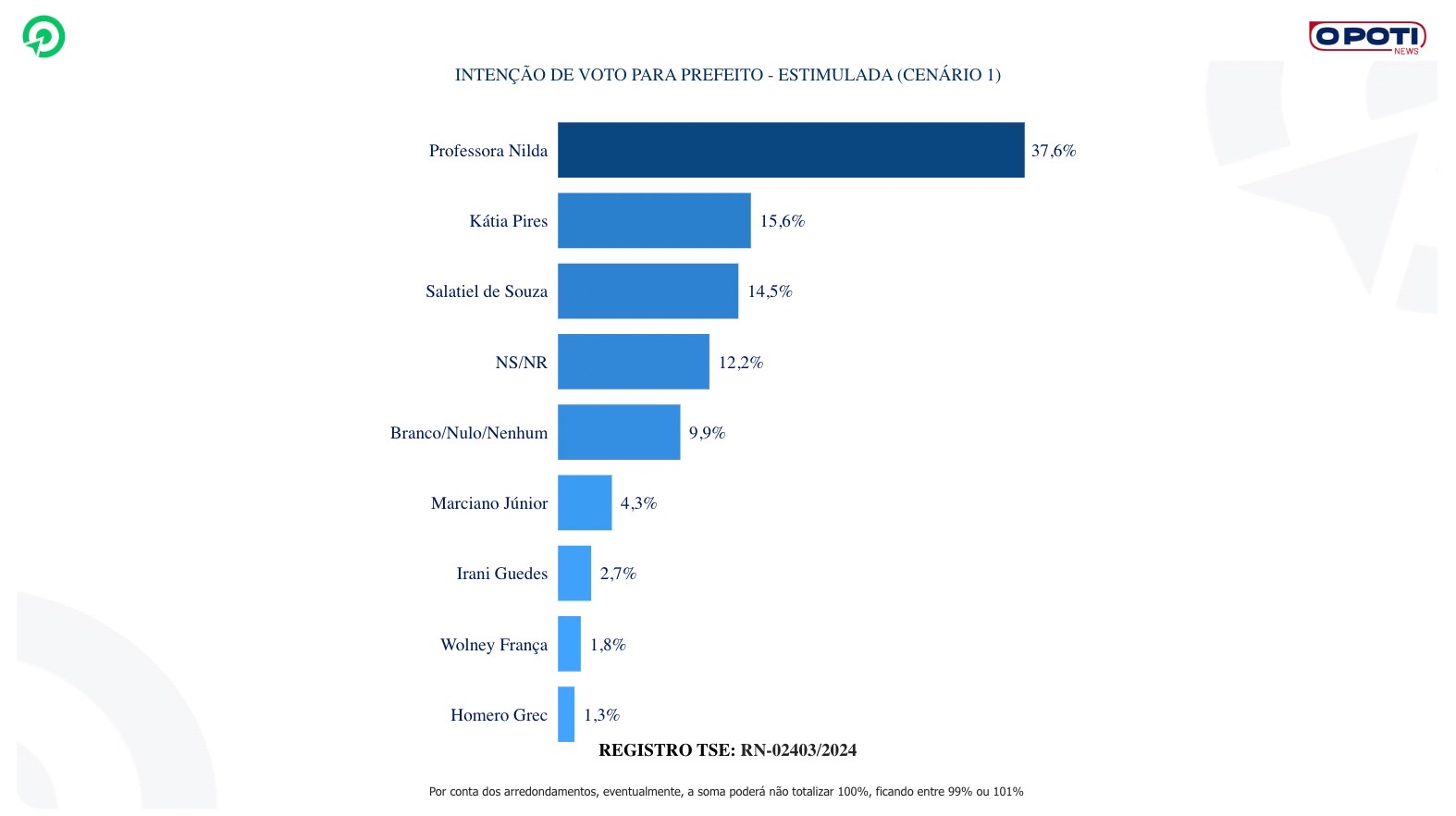 A pesquisa foi registrada no TSE/RN sob o número 02403/2024, foram ouvidos 598 eleitores de Parnamirim, nos dias 21, 22 e 23 de março de 2024. A sondagem tem nível de confiança 95% e margem de erro 4 pontos percentuais para mais ou para menos.