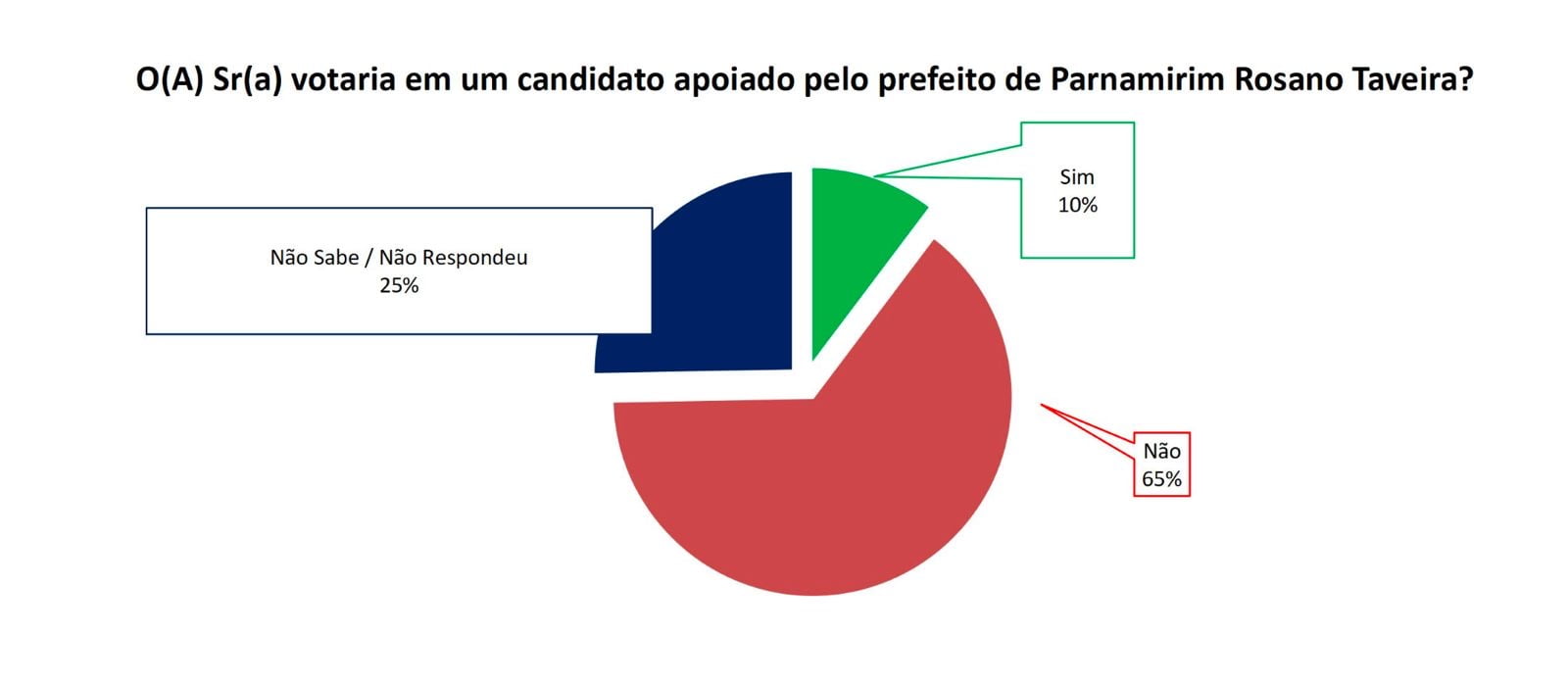 No item capacidade de transferência de votos pelo prefeito Taveira, a pesquisa Seta trouxe a seguinte questão: “O (a) sr. (sra) votaria em um candidato apoiado pelo prefeito de Parnamirim Rosano Taveira?”. A grande maioria dos eleitores entrevistados, o correspondente a 65%, respondeu que não votaria, não sabe/não respondeu foi 25% e apenas 10% afirmaram que votam no candidato do prefeito.