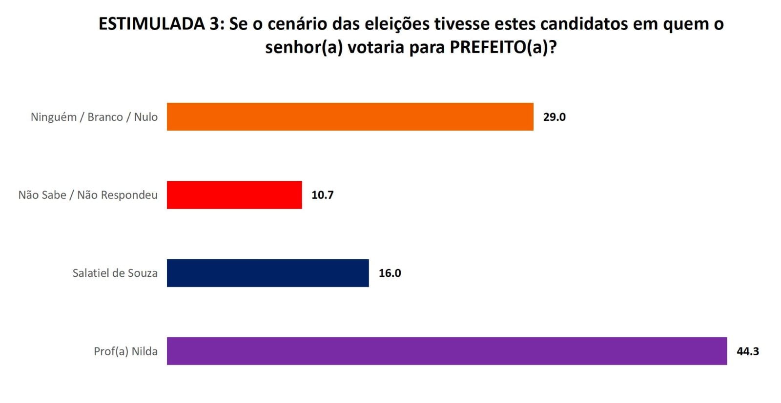 Na questão estimulada, quando o entrevistado aponta os nomes dos pré-candidatos a prefeito, a Professora Nilda figura em primeiro lugar com 35,6% das intenções de voto, abrindo uma vantagem de 21,3 pontos percentuais sobre Kátia Pires, citada por 15,3% dos eleitores ouvidos. Salatiel de Souza aparece com 11,1%, Irani Guedes tem 2,7%, Marciano Júnior foi citado por 1,3%, Wolney França foi citado por 0,4% dos entrevistados, Homero Grec aparece com 0,3%, Eron do PT tem 0,1%, ninguém/branco/nulo tem 26,9% e não sabe/não respondeu 6,3%.