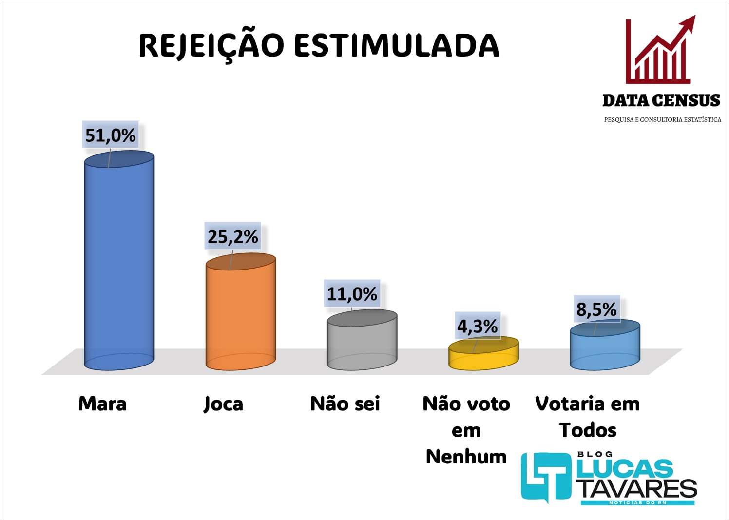 No cenário rejeição, Mara é a mais rejeitada com 51%, contra 25,2% do prefeito Joca Basílio, 11% Não Sabe, 4,3% Não vota em Nenhum e 8,5% Votaria em Todos.