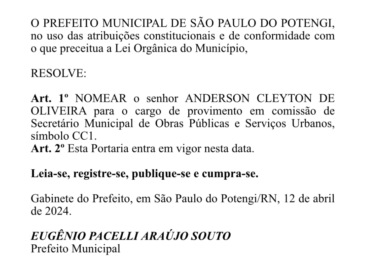 Como adiantamos aqui em nosso Blog, o Diário Oficial dos Municípios do RN, trouxe nesta segunda-feira (15) a nomeação do engenheiro civil, Anderson Cleyton, como o mais novo Secretário de Obras Públicas e Serviços Urbanos do município de São Paulo do Potengi.