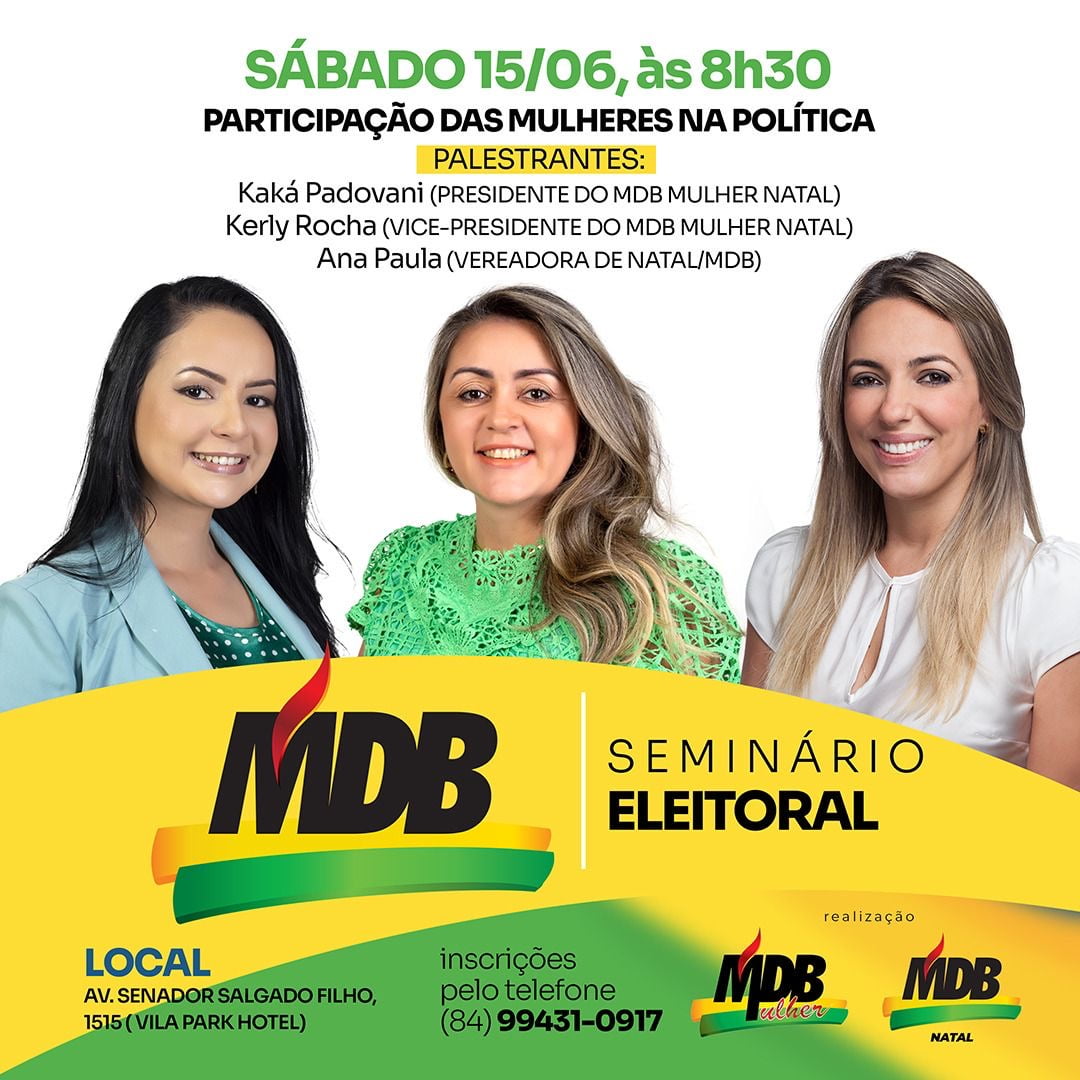 O Movimento Democrático Brasileiro em Natal (MDB) promove, no próximo sábado, dia 15 de junho, a partir das 8h30, um seminário para promover a participação feminina na política. O objetivo é discutir ideias que promovam cada vez mais a presença das mulheres na política. O evento é aberto ao público geral e acontece no Villa Park Hotel. As inscrições devem ser feitas por telefone.