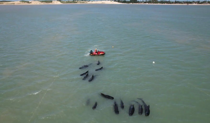 Na manhã de hoje (3) os militares do CBMRN com apoio de motonaúticas, e em parceria com o Centro de Estudos e Monitoramento Ambiental (CEMAM, Projeto Cetáceos da Costa Branca (PCCB-UERN) e pescadores locais, estão movimentando os animais até uma área segura.