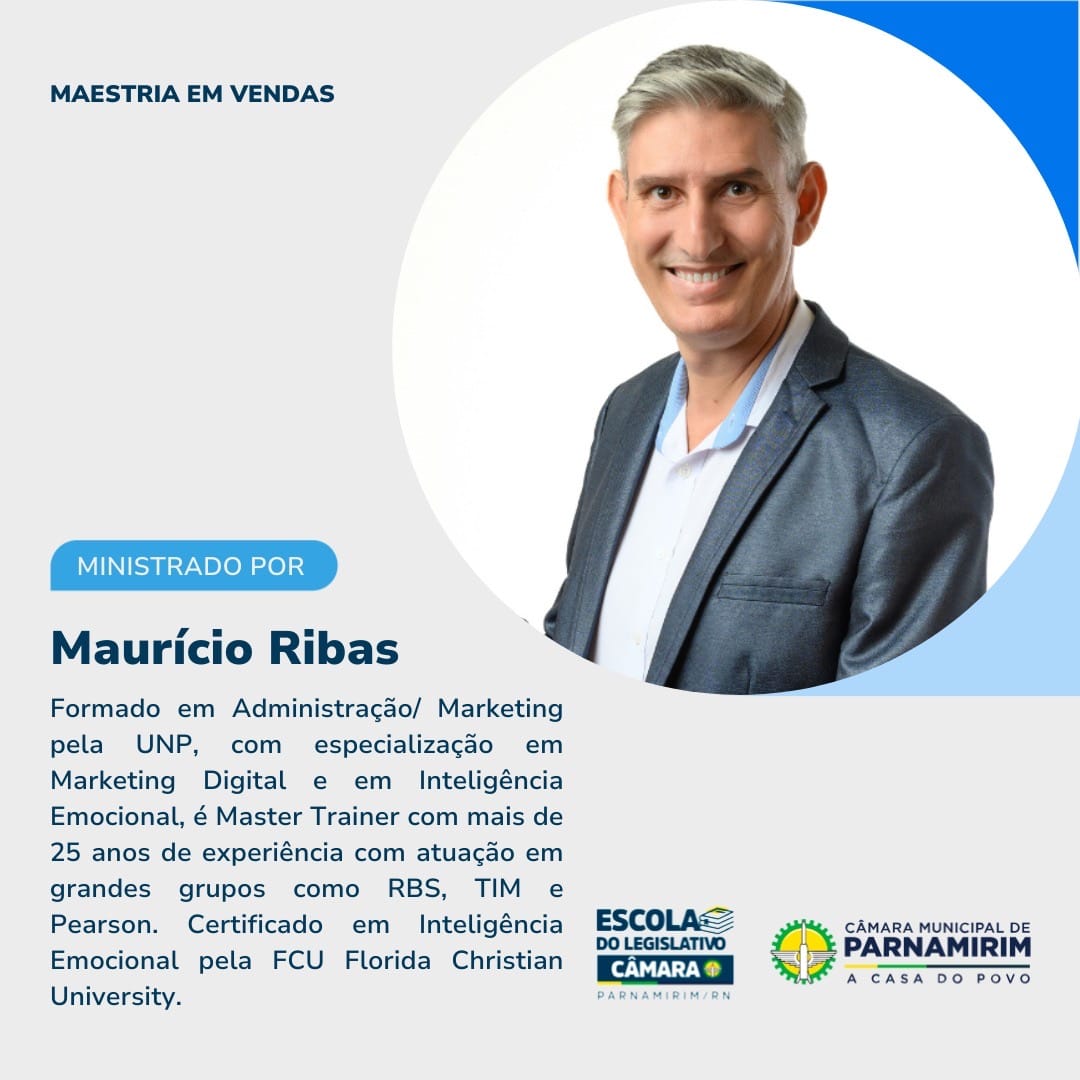 A Escola do Legislativo da Câmara Municipal de Parnamirim realiza, nesta quarta e quinta, dias 13 e 14 de novembro, o curso Maestria em vendas, ministrado por Maurício Ribas. O curso é gratuito e ocorre no Plenarinho Professora Eva Lúcia, das 18h às 22h, e está aberto para o público em geral