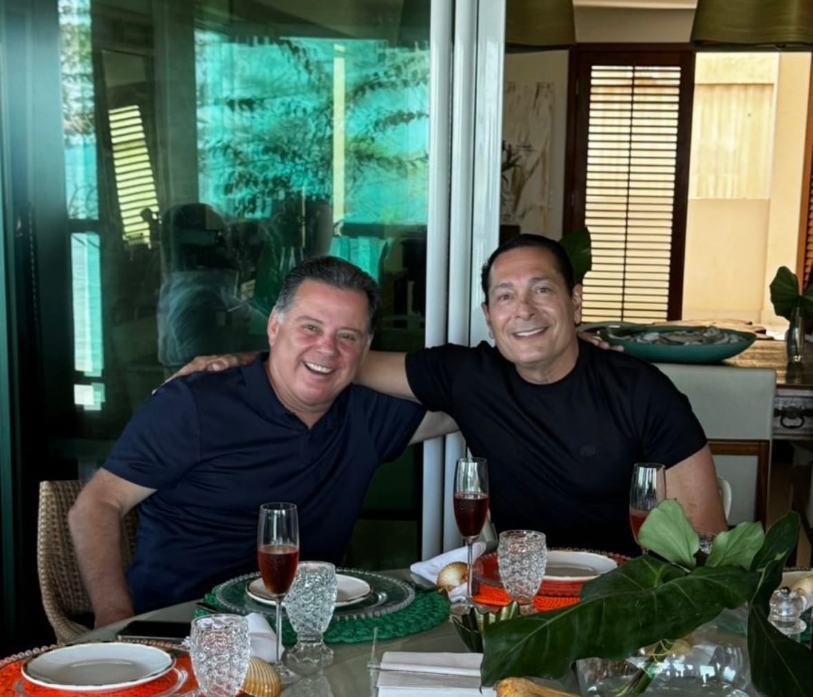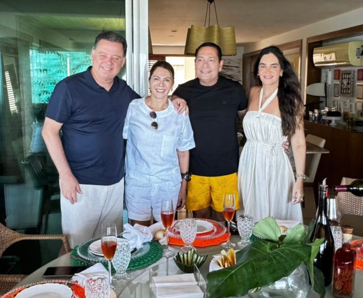 Marconi Perillo e sua esposa, Valéria, foram recebidos por Ezequiel e Ingrid na praia de Pirangi, onde participaram de momentos de confraternização.