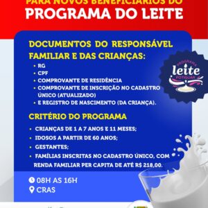 Famílias interessadas em participar do Programa do Leite Potiguar deverão realizar cadastro ou atualização de dados no município de Lagoa de Velhos a partir da próxima segunda-feira (16).