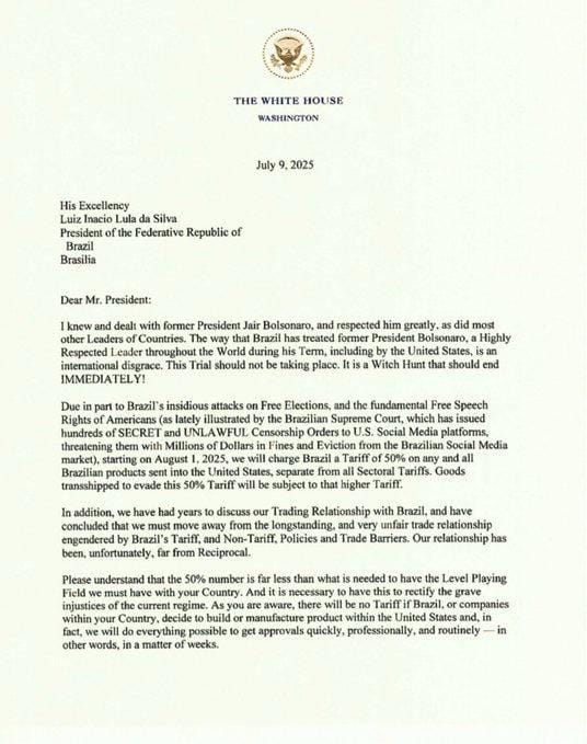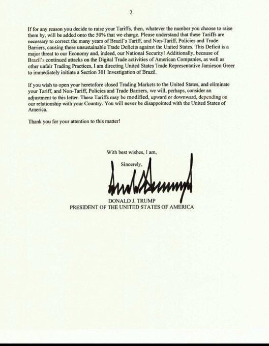 “Em parte devido aos ataques insidiosos do Brasil contra as eleições livres e os direitos fundamentais de liberdade de expressão dos americanos (como recentemente ilustrado pelo Supremo Tribunal Federal do Brasil, que emitiu centenas de ordens de censura SECRETAS e ILEGAIS a plataformas de mídias sociais dos EUA, ameaçando-as com multas de milhões de dólares e expulsão do mercado brasileiro), a partir de 1º de agosto de 2025, os EUA imporão ao Brasil uma tarifa de 50% sobre qualquer envio de produtos brasileiros aos Estados Unidos, além de todas as tarifas setoriais.”